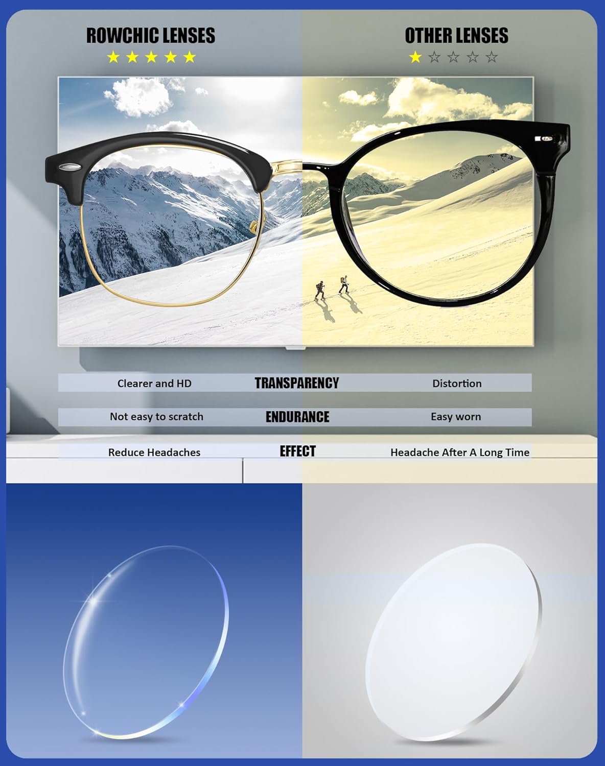 Personalize Your Eye Protection: Anti-Blue light lenses customize your eye protection with ROWCHIC’s anti-blue light lenses. Featuring clear UV400 coating, these lenses effectively block up to 99% of harmful blue light.
