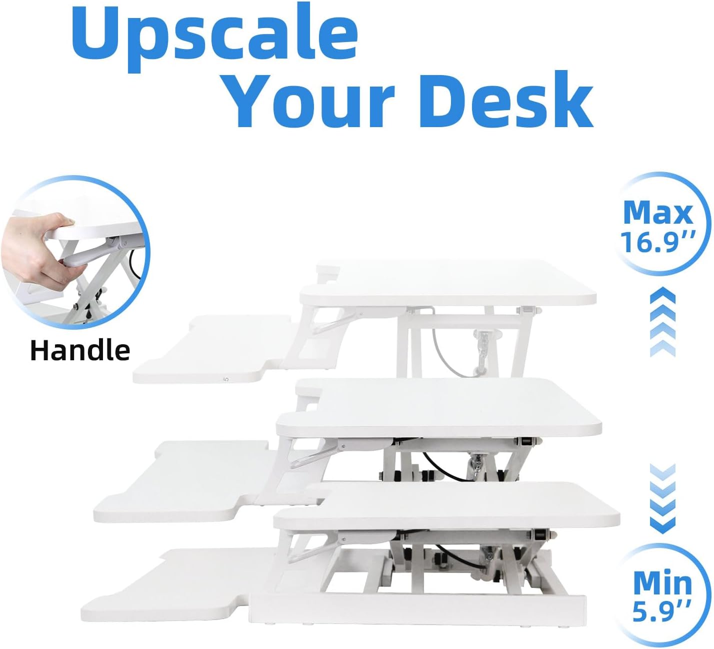 Double Layer Office Space: Adjustable rising desk converter with a 31.5” wide spacious work area. The lower deck has room for your keyboard and mouse, while the upper deck has space for your computer or laptop, and other work or gaming accessories.