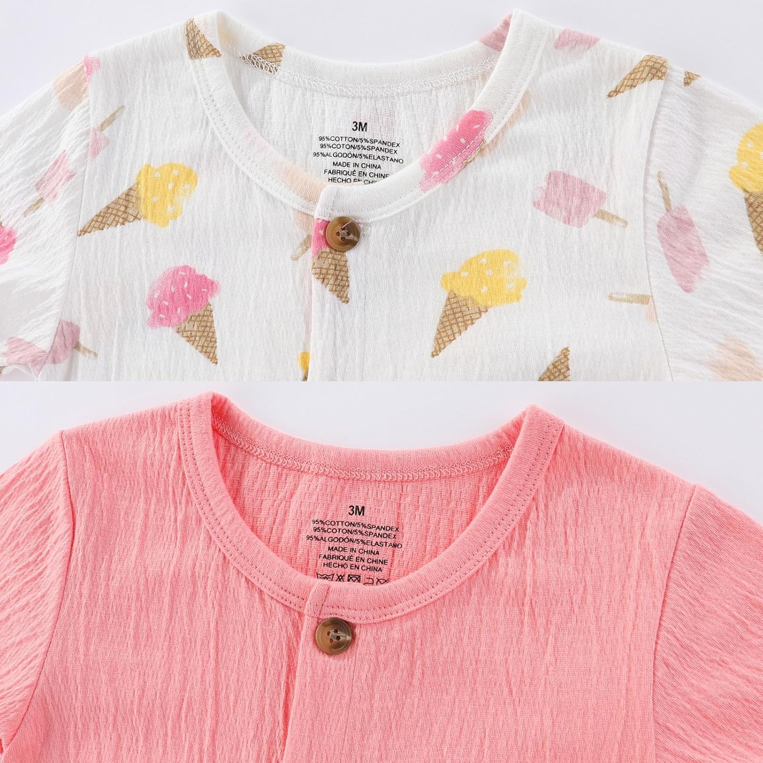 These are adorable and comfortable for the baby. Easy to snap the bottom before putting them on like a pair of pants. These are light weight and after being washed multiple times they still look like new.