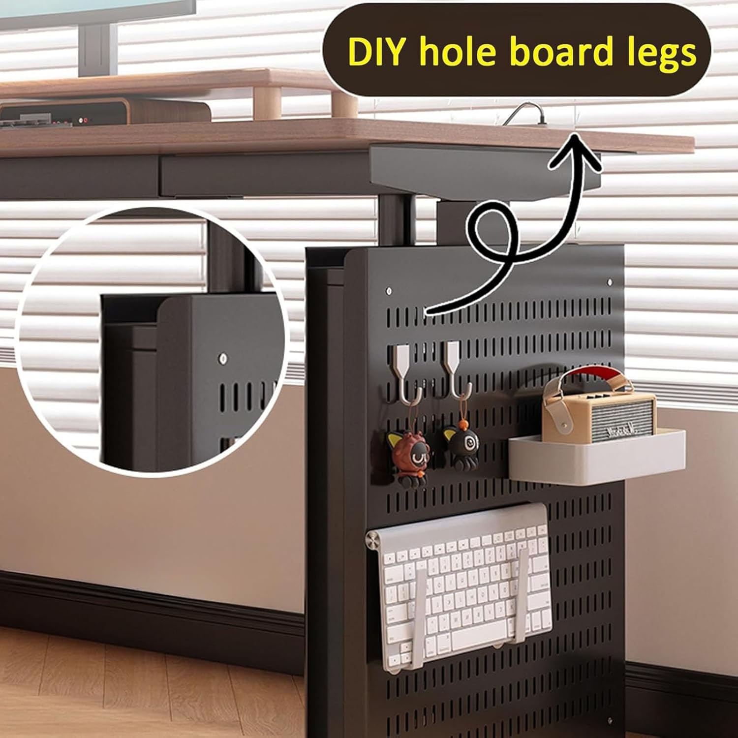 sit stand desk uses perforated board cabinet legs for storage, both sides can be used for storage, stable load-bearing.