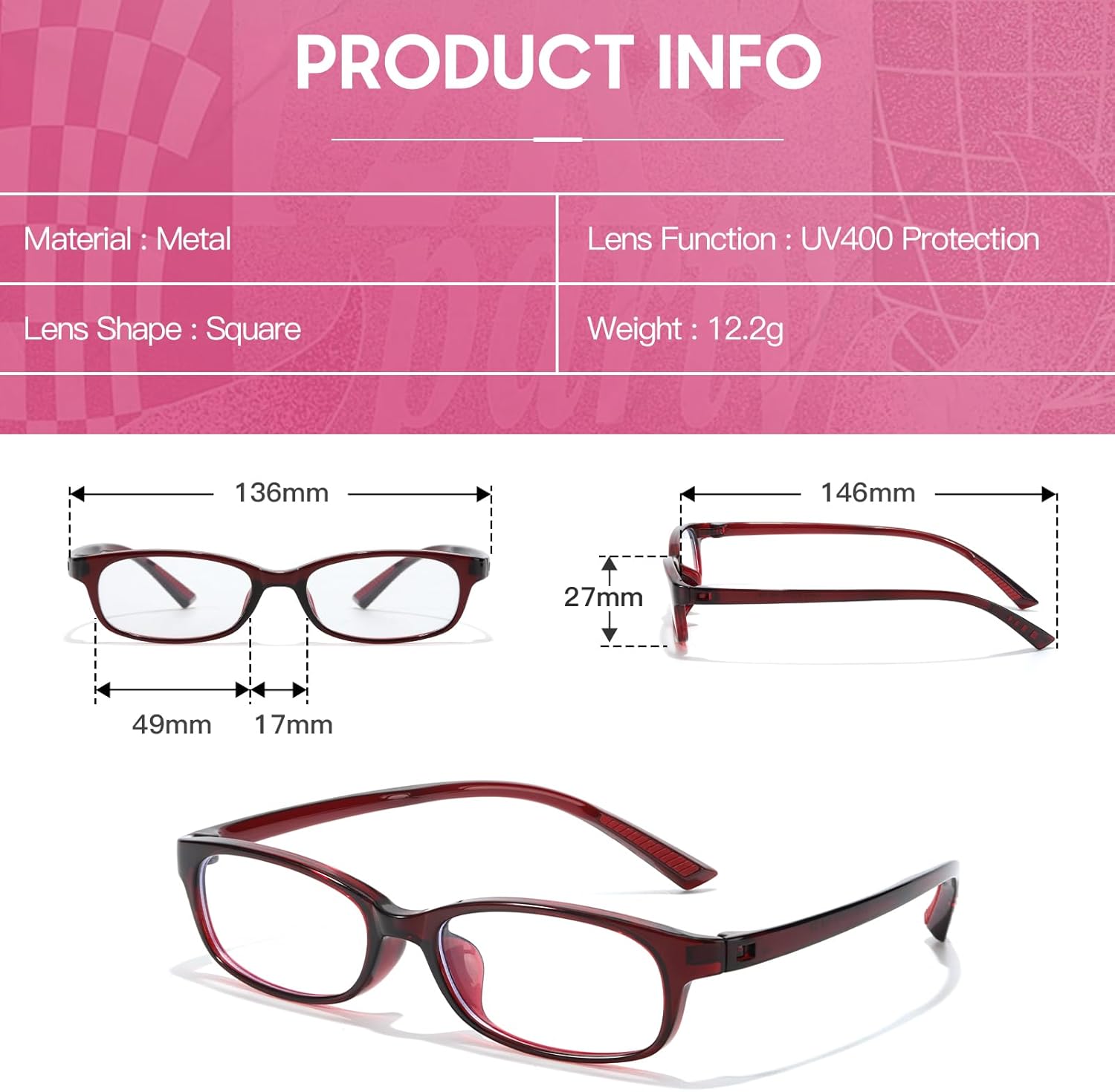 Love these glasses. Don’t love their name/description:”Fashion Fake Glasses Rectangular Y2k Small Eyewear Frame Anti Blue Light for Women Cosplay Glasses” Seriously? Ok, I know, it’s not my business – literally.I chose the one’s in Red & “in person” they’re pretty much the same as they show on my monitor. I’m used to wearing much larger glasses but that’s because they’re mainly all sunglasses. I can’t imagine wearing them as protection indoors against the blue light from my devices. So, the size of these are perfect for the purpose for which they’re designed. I also like the cool “studious” look wearing these give me. Getting serious for a second, these are designed to protect our eyes from the dreaded blue light we hear about emitting from all our devices & attacking our eyes, creating sleep disturbances, etc. Ok, so to begin with, along with the glasses inside the box there is a small blue instrument inside of which is a tab that needs to be pulled out as it’s there preventing this small blue instrument, device, thingy from doing something. Upon closer inspection, a tiny “bulb” can be seen on one end & once the small tab is removed we can see there’s a button or tab that when pressed turns on a small but bright blue light. So, a teeny tiny blue flashlight that illuminates using a bright blue pinhole sized light. What?? Exactly!!Also, accompanying it in the box, there is also something that looks like an unsigned credit or debit card. There’s a white horizontal “bar” that looks & feels (to the touch) that, just like the ones on a credit/debit card, runs across the card. There is some writing in Chinese, that once translated, says “Anti-blue light test card” There are instructions for us to use the “blue light generator” (so that’s what it is!) to illuminate the white square [they mean bar] below. The stronger the blue light, the darker the colour will be.” On the bottom right of the card there are 3 little boxes (with a check mark in each) which reads from left to right “Anti blue light”, “Radiation protection”, “High definition”. I immediately tested it & noticed a purple colour appear which intensified in relation to the time & distance the blue light generator was held from the white bar. I tried to use it to write my name because immaturity is my hobby – just kidding, kind of.Ok so the generator worked on the white bar but what about the glasses. Exactly! So I tested them. I held the generator right up against the lenses of these glasses & there was nothing. No purple, no lavender, not even hint ‘o lilac. Yes, I’m being light-hearted but bottom line no blue light permeated the lenses of these glasses, actually to be 100% accurate, they claim to block out 99% of Blue light. Wonderful! But, I wanted to make absolutely sure.So, I got a pair of reading glasses that don’t have blue light protection (that I know of anyway) & tested them. There was nothing at first but when I held the generator closer to the lenses, which were right up against the white bar, I noticed some purple colour start to appear. It was very subtle at first but intensified slightly with time. Great idea to have this ability to test “Fashion Fake Glasses”. After testing these glasses & feeling satisfied about the efficacy I can now use my “Blue light generator” as a stand-in as a laser pointer for my cats! Blue light protection AND a cat toy?! I am joking! The glasses are light as a feather, so light that it’s easy for me to forget they’re on. Their weight, or lack thereof, is not the only reason though, because they’re very comfortable as well. They don’t dig in anywhere on my face, the arms don’t dig in or leave indentations on the sides of my face – mainly because they don’t touch the sides of my face, the end of the arms that rest on top of or, in some cases, go behind the ears, are barely discernible.There is a slight noticeable difference in lense colour. I think it’s on the yellow side. It can’t be noticed when looking AT yourself, like in a mirror. Once the glasses are worn for a while, for ME that’s almost immediately, the colour change goes unnoticed. I would suggest though that they be removed if you need to be sure of a colour – like if making a purchase on Amazon & you’re trying to choose between colours of a t-shirt, or a comforter, or a couch – anything, really, then the glasses should be removed.These glasses come with a soft dove gray microfibre cleaning cloth and a similar drawstring pouch in which to house the glasses when not in use or when travelling. Included in the box that holds everything is a business card sized Thank You message which asks for a 5 Star review (if the purchaser likes their glasses) & a request for a direct email in case of any issues but there’s no evidence of an email address. The regular price of these glasses are $21.99 but at the time of this writing, there is 9% off, so they’re $19.99. At regular or sale price, I think these glasses are well worth the price. They come in a good variety of colours & are even sold in a “pair pack” for $35.99 (2 different colours).I’m extremely pleased with mine & would purchase another one to have at home & the other at work, or just as a fashion choice which at this price, (depending on your budget (of course) would be easy to do.