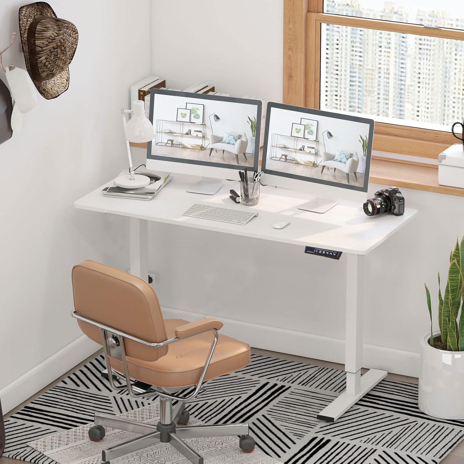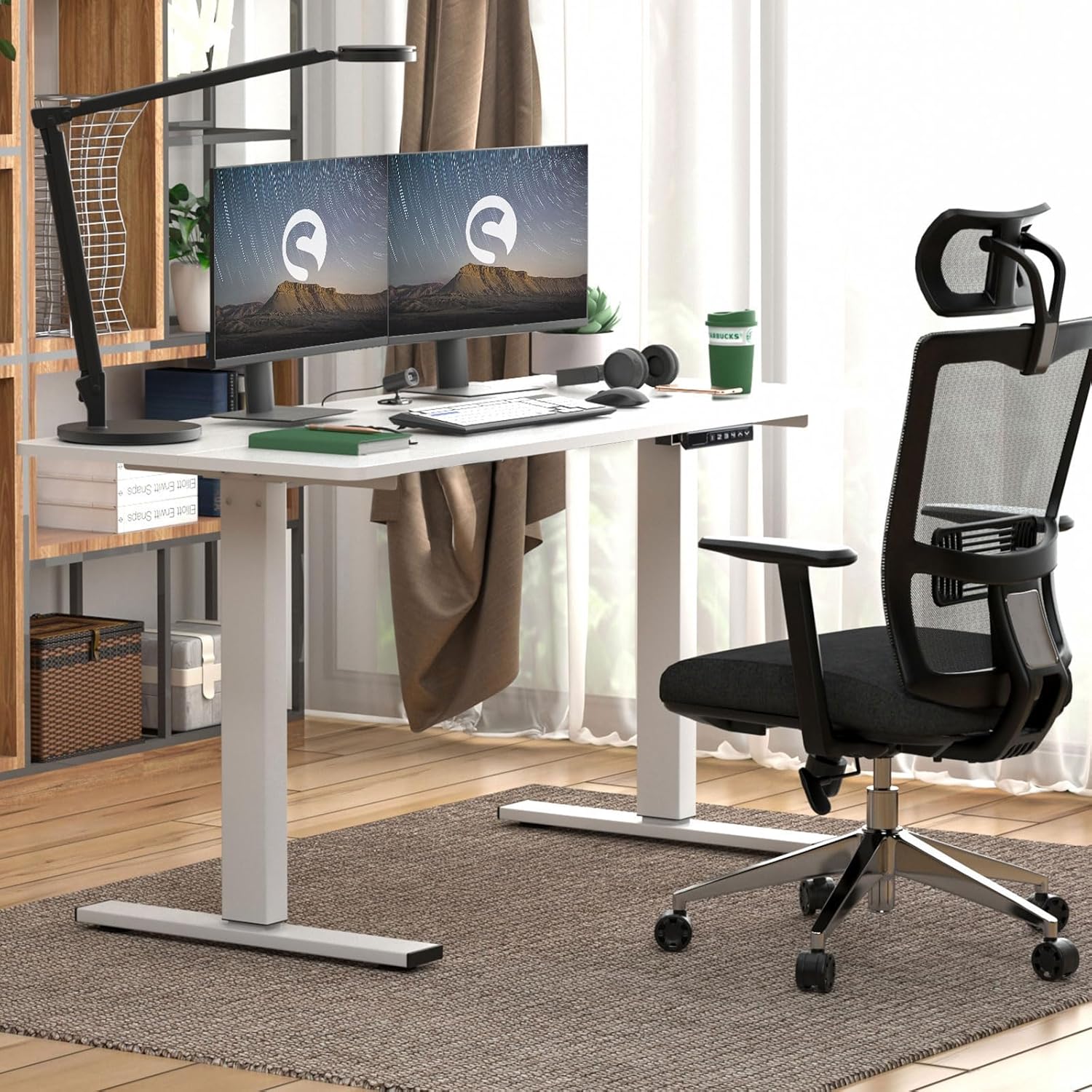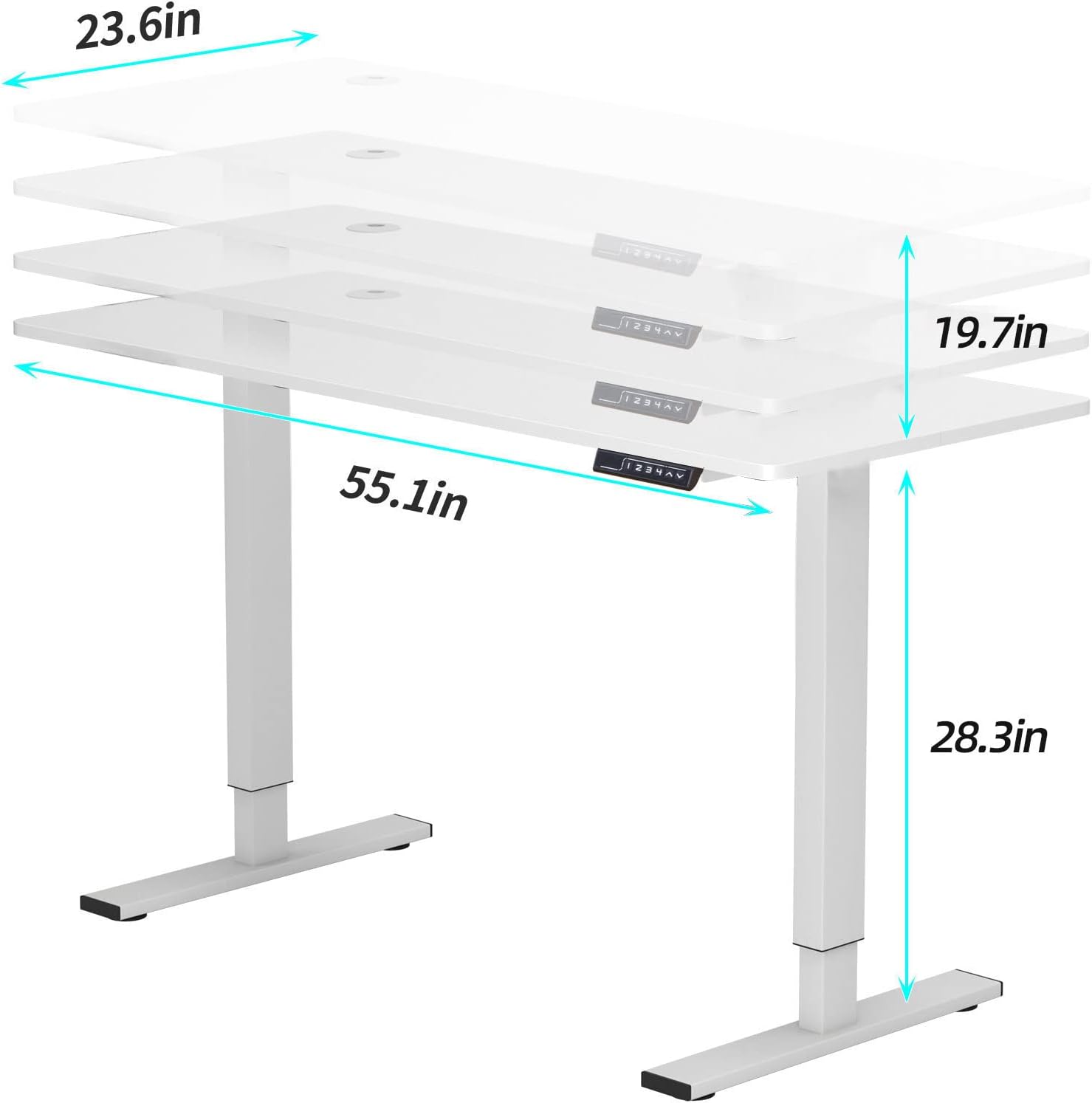 【Sturdy Construction】 Featuring a spacious 55.1” x 23.6” P2 particleboard tabletop, our electric standing desk offers ample space for your computer setup, monitors, and essential accessories, the sturdy table legs, boasting thickened tubes, ensure stability and durability, its robust frame and solid construction can support heavy loads without compromising on stability, providing a reliable workstation for your daily tasks.