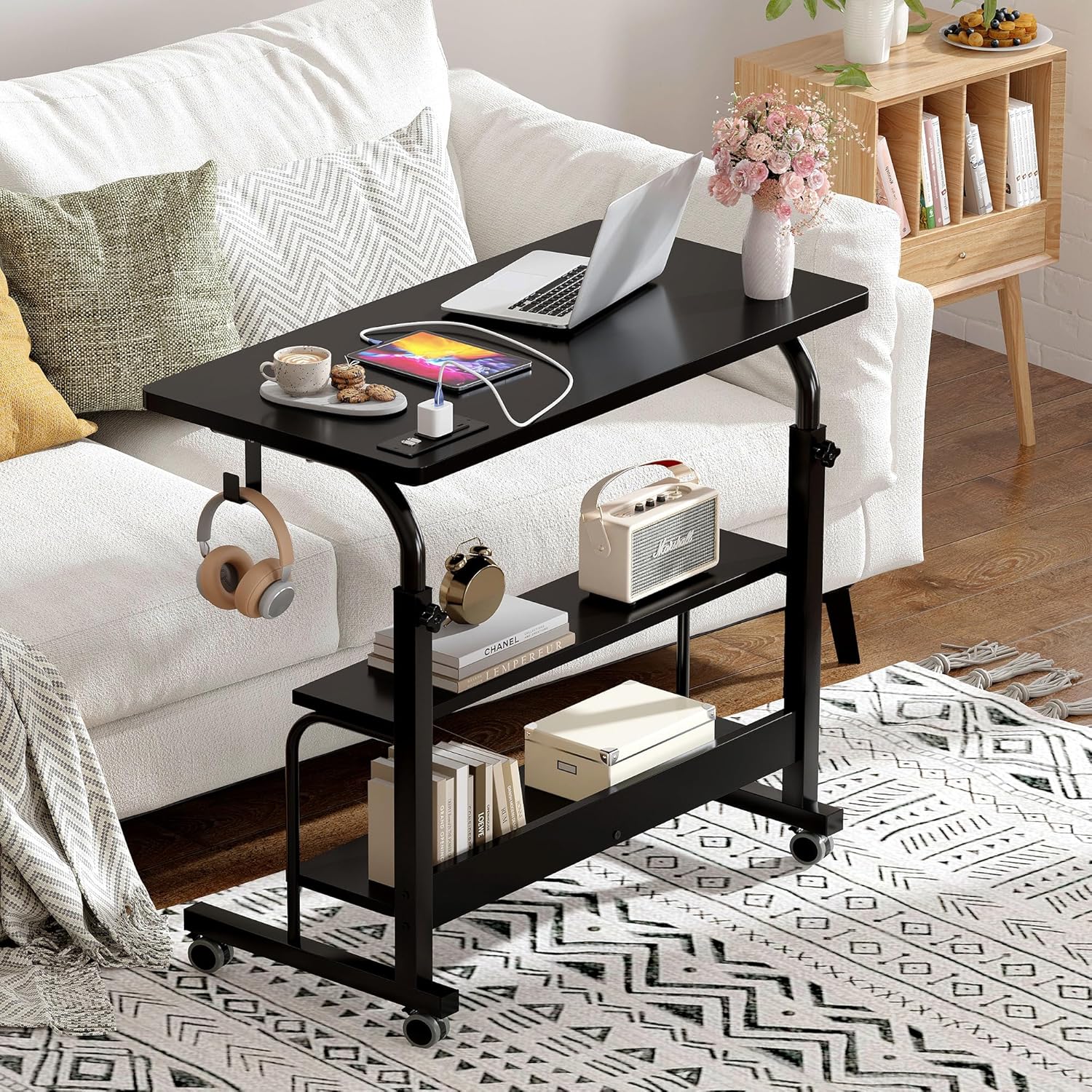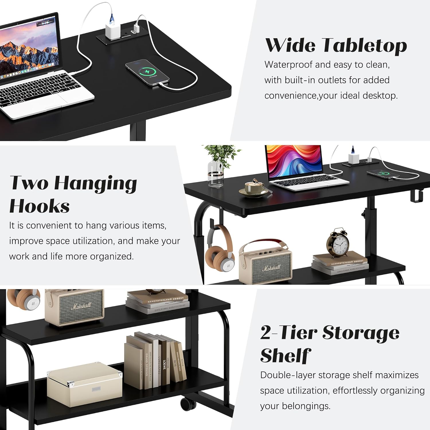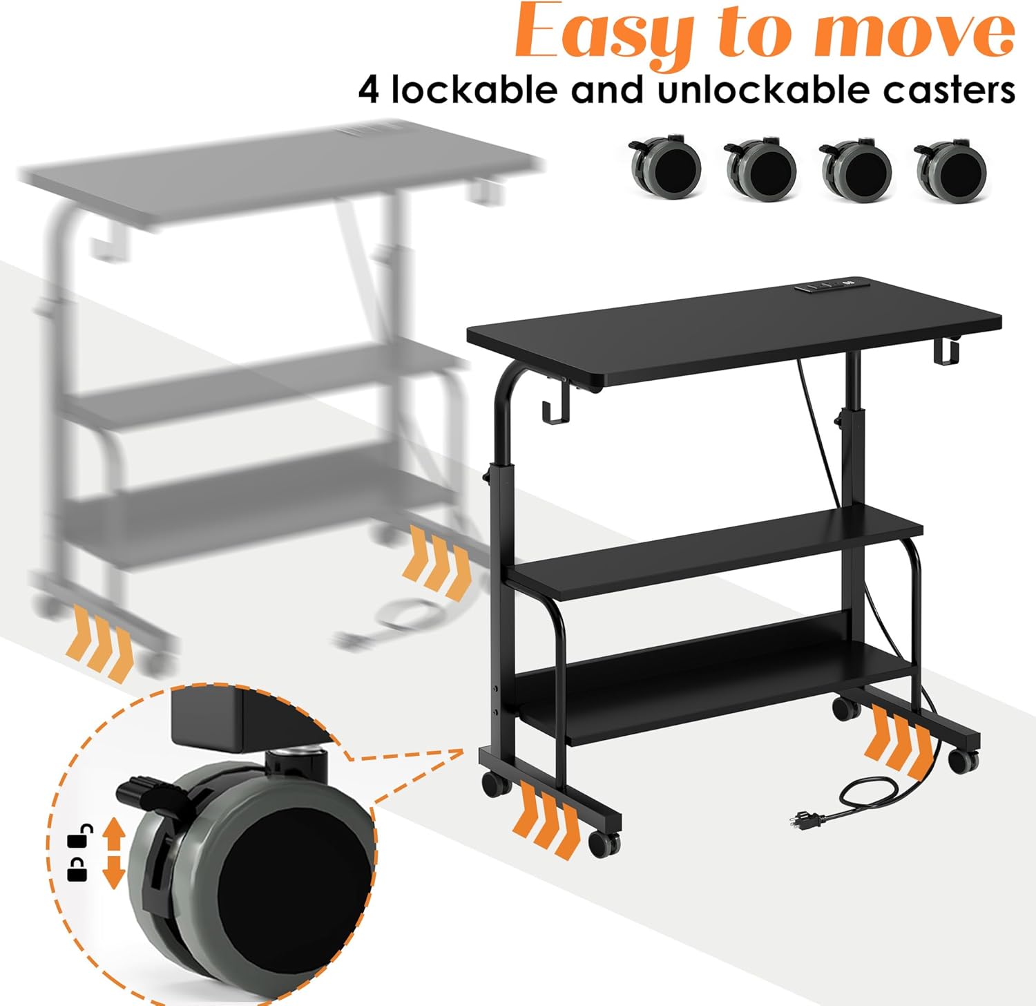 SogesHome Adjustable Mobile Standing Desk Rolling Small Computer Desk with Charging Station Portable Laptop Desk with Storage Shelves and Wheels for Home Office (Black, 31.5 inch)