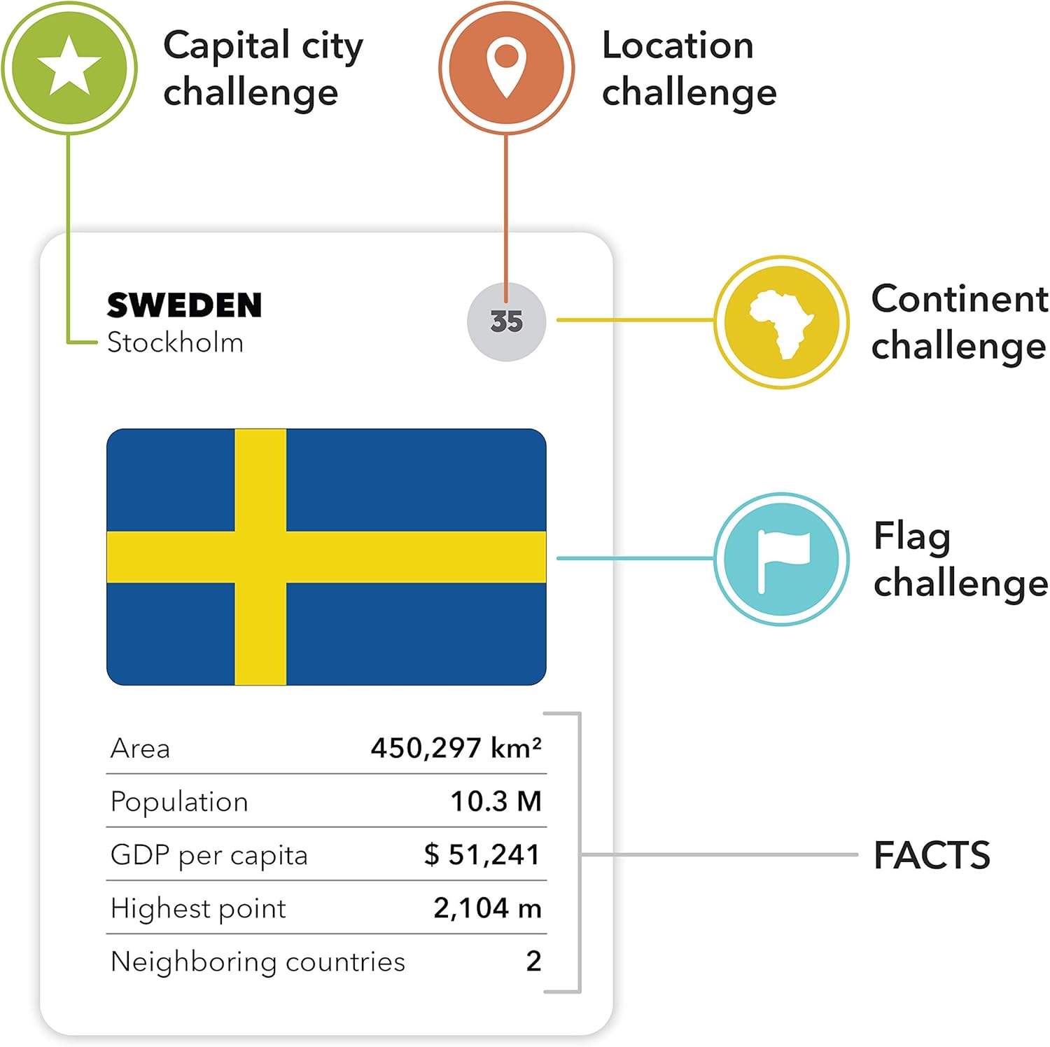 My child took a liking to geography and this was great to expand his knowledge. The gameplay is such that the most knowledgeable player doesn’t always win and you can give people an advantage by allowing them to guess continents while others have to guess flag/location/capital city.