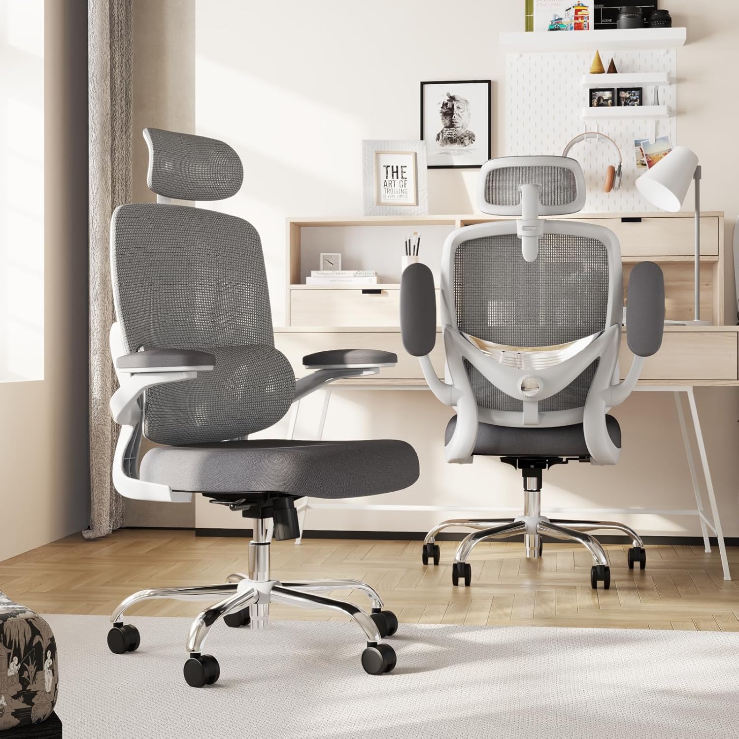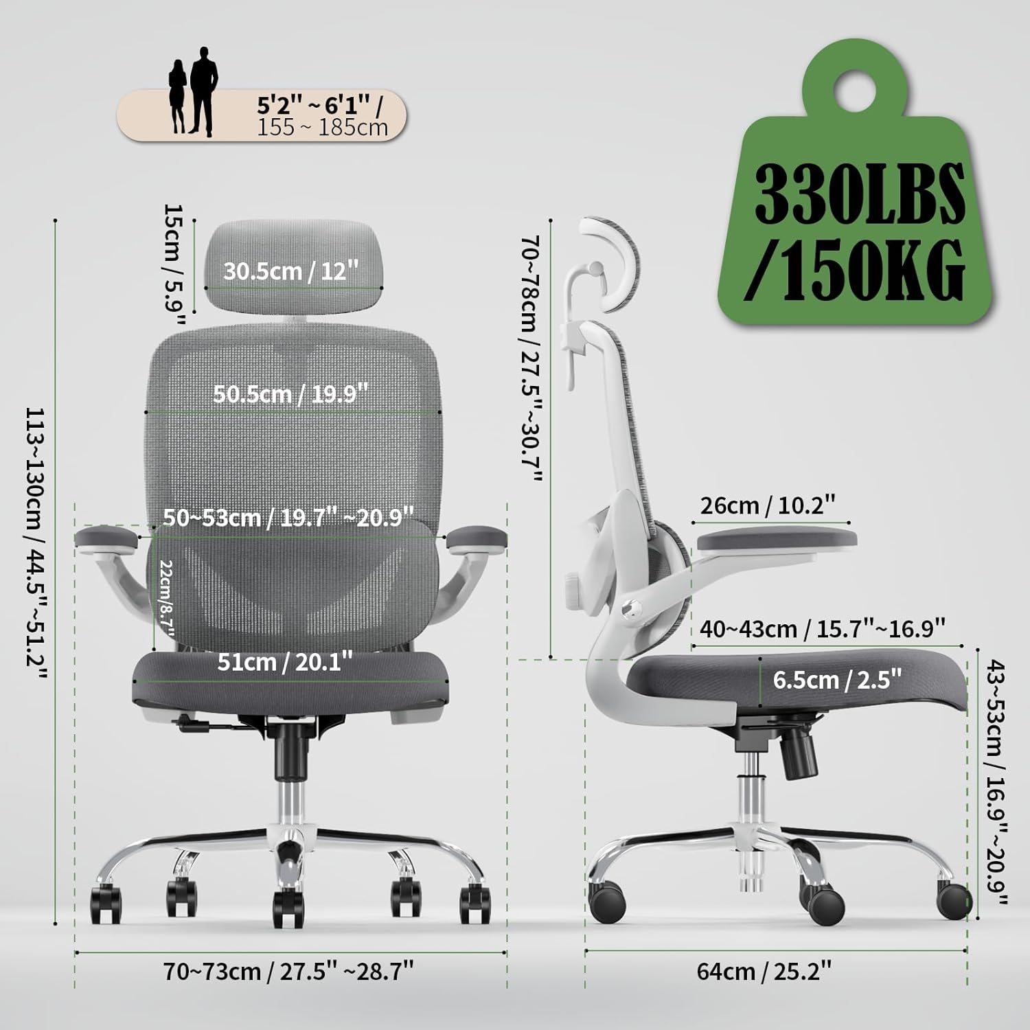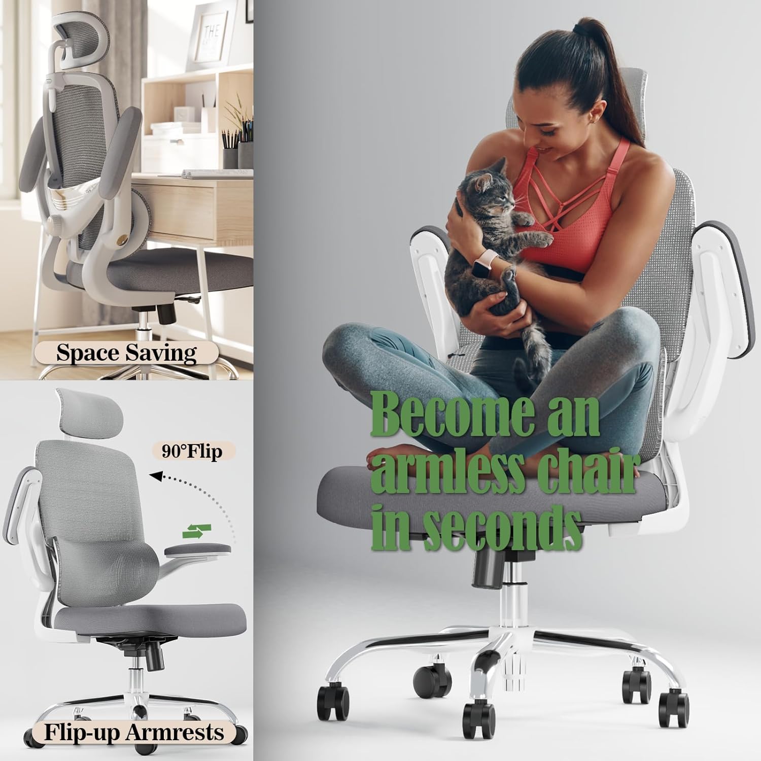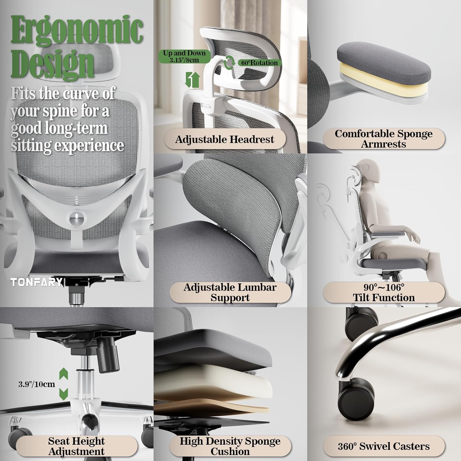 TONFARY Ergonomic Home Office Chair, High Back Mesh Desk Chair with Adjustable Lumbar Support, Flip-up Armrest, Removable Headrest, Swivel Computer Gaming Chair, Space Saving, For 155-190CM, 330LBS