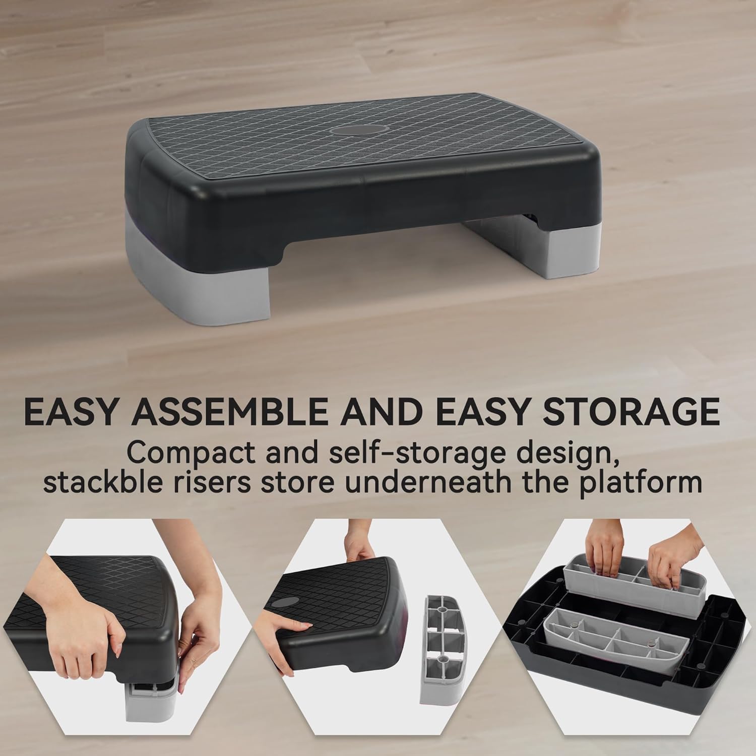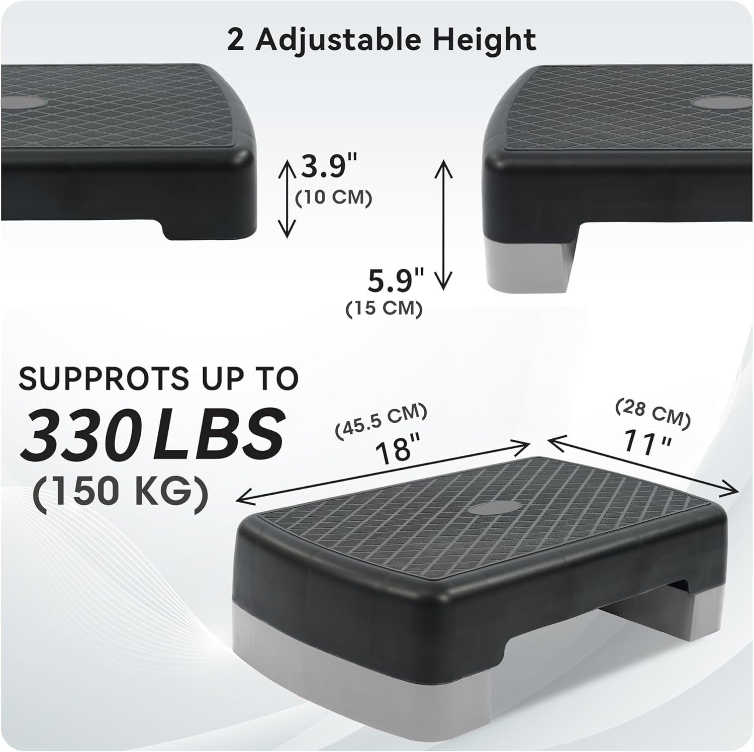 [Adjustable Step Platform]: 18-inch long and 11-inch wide. Customize your workout with adjustable risers, allowing you to switch the height from 3.5”to 5.5”for different fitness levels and exercises.