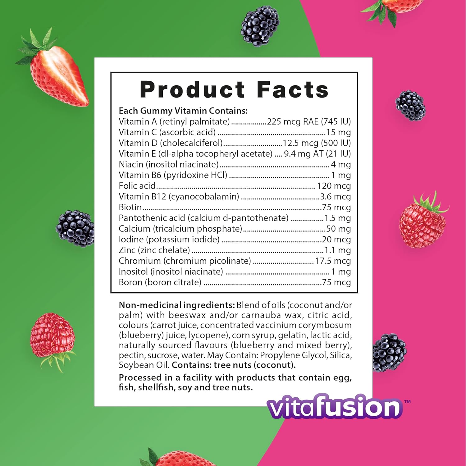 Vitafusion Women’s Multivitamins provide a multivitamin formula that has been specially formulated to support the specific health needs of women. A fusion of essential vitamins, minerals and naturally sourced fruit flavours, these great-tasting gummies provide a convenient alternative to hard-to-swallow pills.