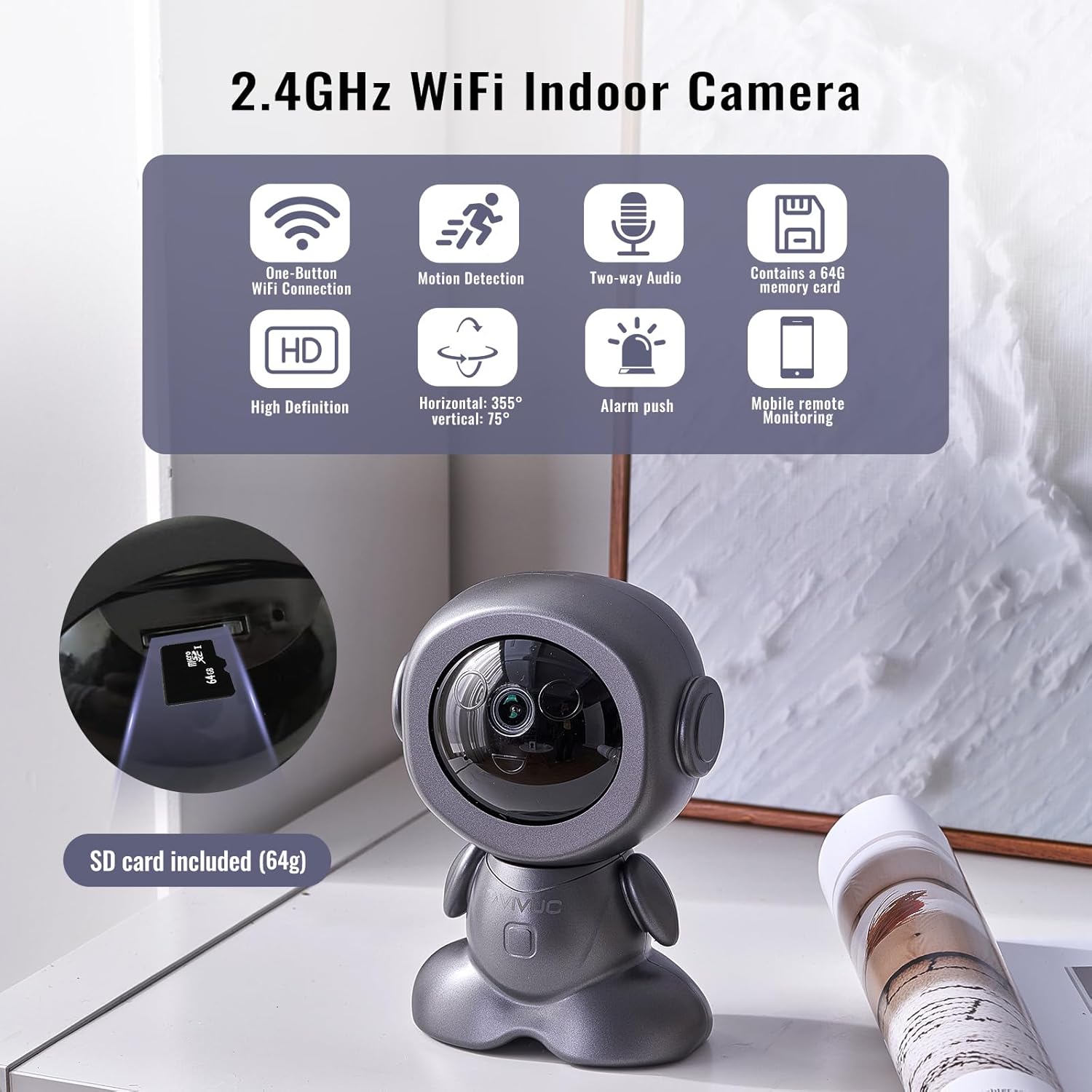 Setting up this robot camera is a easy —just scan the QR code at the bottom and you’re all set. For the price, the features you get are pretty impressive. It comes with a 64GB SD card, HD video, motion detection, night vision, and two-way audio. The app is super user-friendly and lets you control the camera remotely. Plus, the 360-degree rotation is a game changer. It has a cute design and fits well in my son’s room. Great value for what you get!