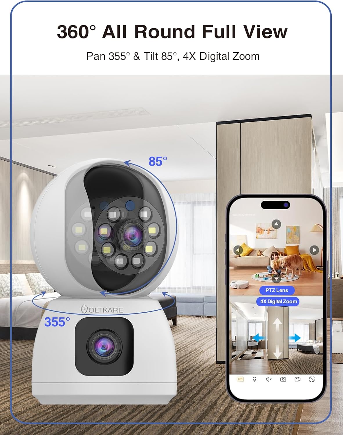 VOLTKARE 2.4G/5G Indoor Security Camera, 360° View & 2 Cameras in 1 Pet Security Cameras with Phone App for Dog/Elder WiFi Baby Monitor, Wireless Home Camera with 2-Way Audio, Color Night Vision.