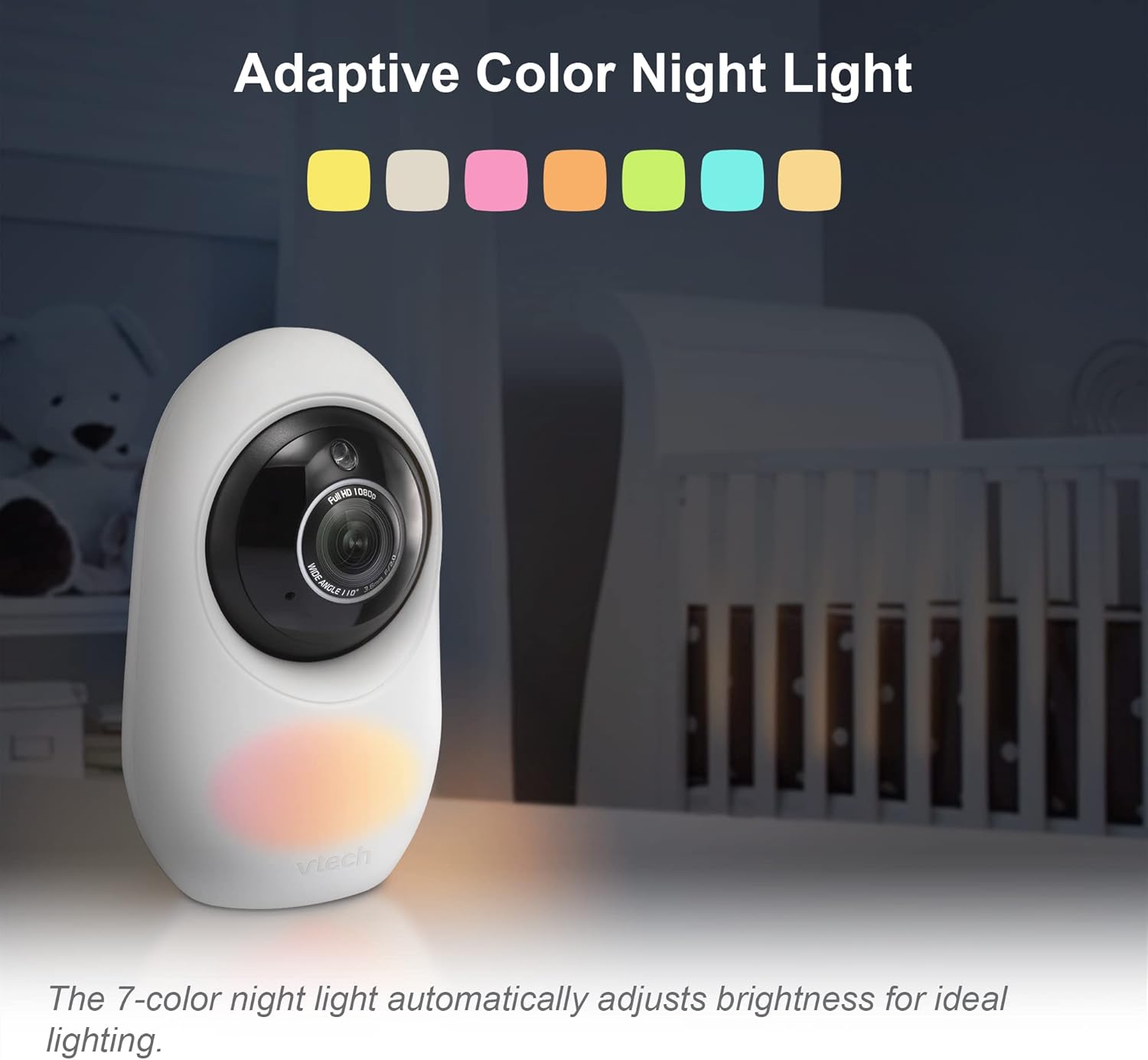 Adaptive night light – The 7 color night light automatically adjust brightness for ideal lighting – Soothing sounds and lullabies – Five calming melodies and four soft ambient sounds, including a trickling stream and white noise, help your baby slip into a sweet slumber.