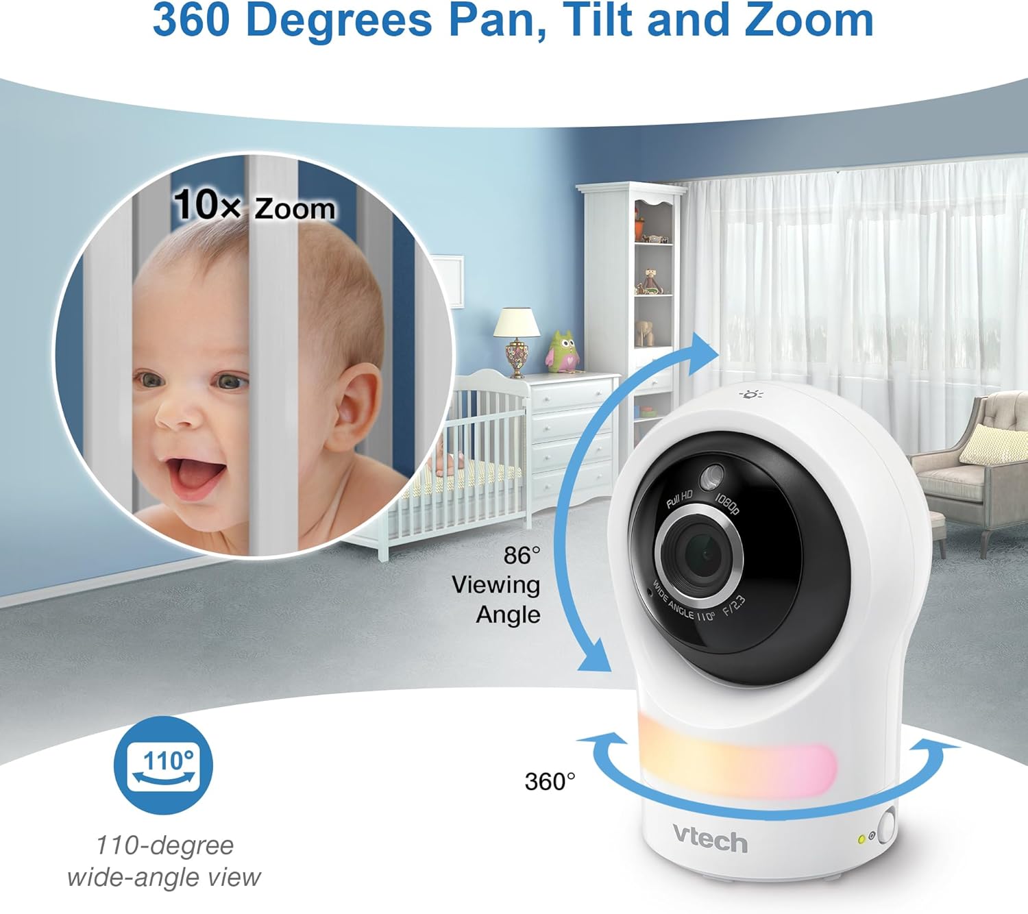 360 degree Pan, tilt and zoom – Watch as your little one moves about. Achieve 360 degree panoramic viewing and view as many as 100 degrees up and down.
