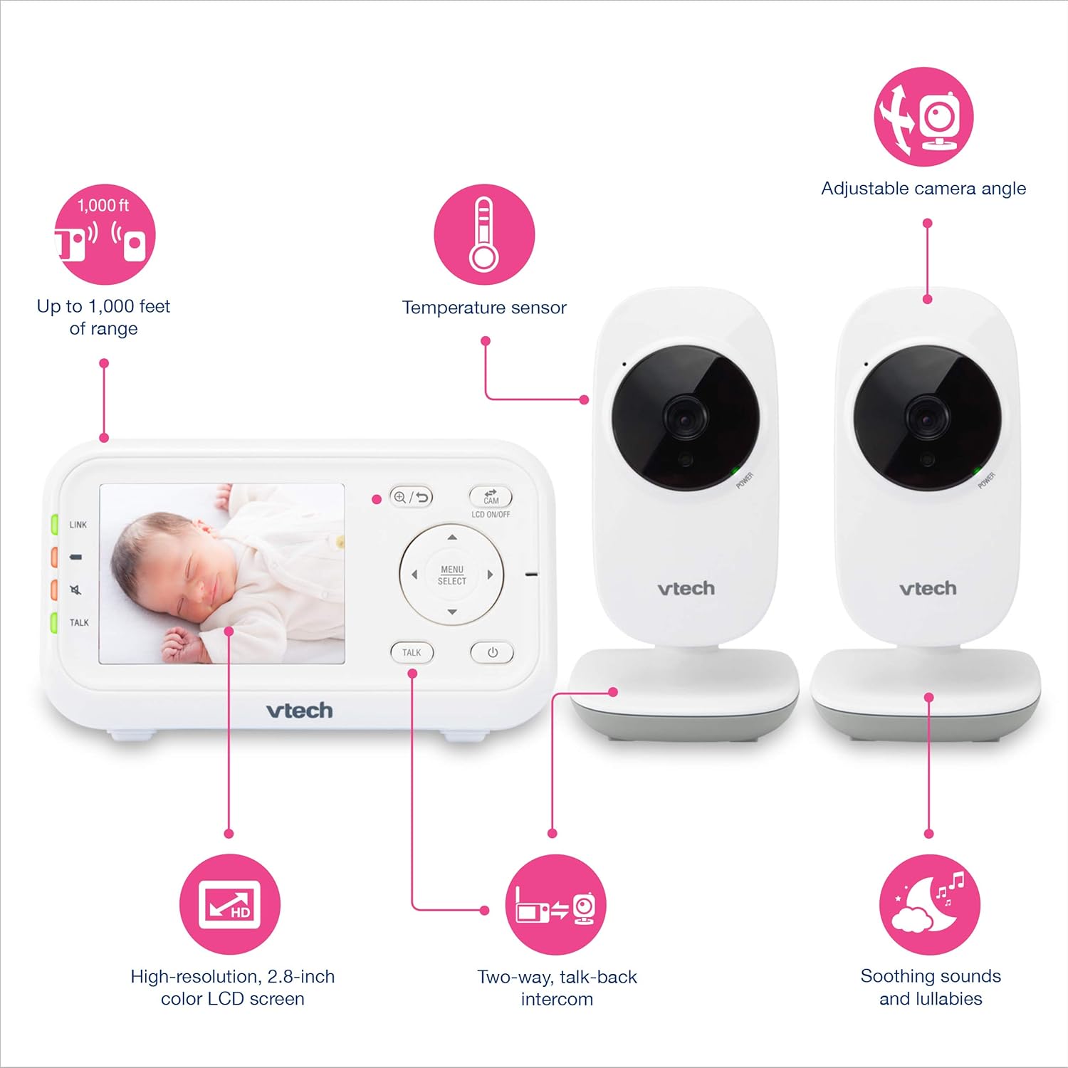 VTech VM3252-2 Digital Video Baby Monitor with 2.8″ LCD 2 Cameras and Automatic Night Vision, 1 Count, White