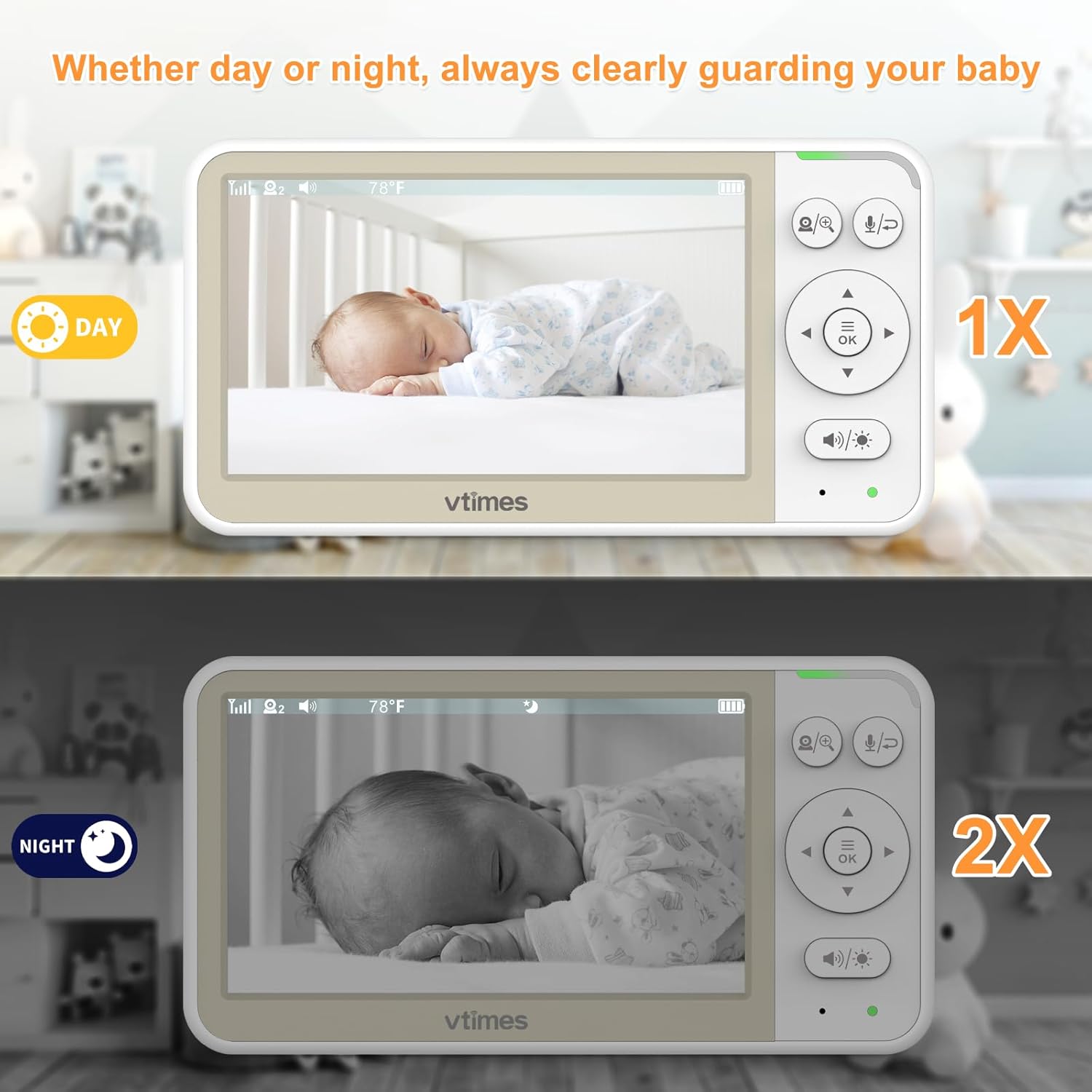 We are so happy with the VTimes 5’’ Screen Video Baby Monitor! The large screen is super clear, and the camera quality is excellent, even in low-light conditions thanks to the infrared night vision. The remote pan-tilt-zoom feature allows us to keep an eye on our baby from any angle, which has been incredibly convenient.I also love the VOX mode, which only activates the screen when it detects sound – no more constant screen monitoring! The two-way talk feature has been great for soothing our little one without having to go into the room. The 4000mAh battery lasts a long time, which means I don’t have to worry about charging it constantly. Plus, the temperature display is a handy extra feature to make sure the room is at a comfortable level.Best of all, no WiFi needed, so I know it’s completely safe and private. Overall, this monitor gives me peace of mind and is well worth the price. Highly recommend it for parents!