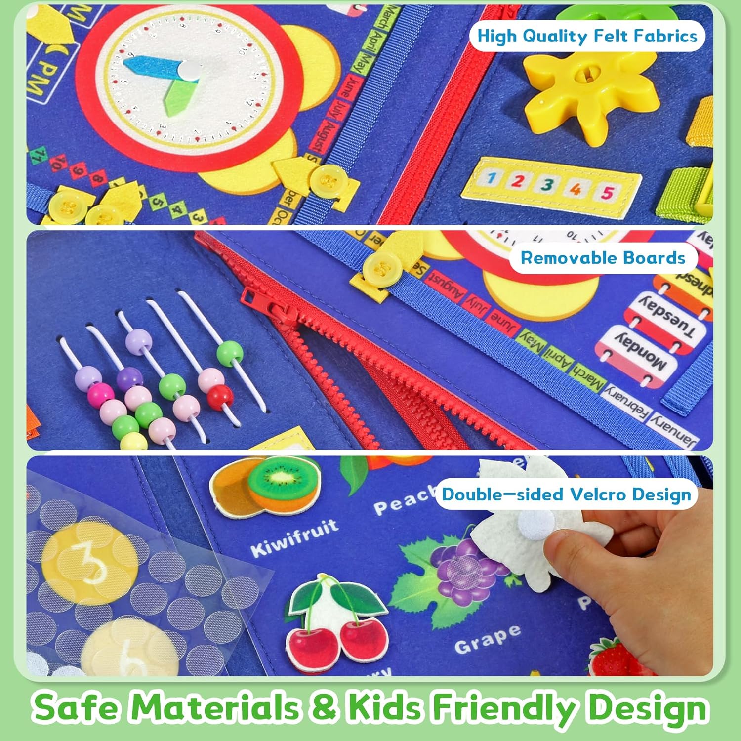 ๐๐ซ๐๐ข๐ง๐ข๐ง๐ ๐๐ก๐ข๐ฅ๐ ๐๐ฅ๐๐ฒ๐ข๐ง๐ : Our montessori toys include: 2-page life skills boards with 15 sensory activities to teach toddlers how to get dressed, buckle,snap, button and tie; 6 cognitive boards: 26 letters, 10 colors, 10 numbers, 9 fruits, 6 body parts, 5 time dimensions; 2 sticky covers: 8 animals. This book not only accompanies your baby in playing, but also trains their basic life skills, cognitive ability and imagination